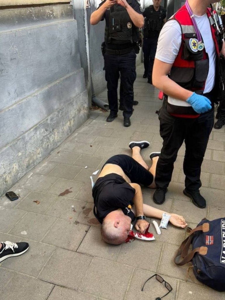 На кадрах видно, что убийца в черно-желтом шлеме (он был одет как курьер службы доставки еды Glovo) поджидал Парубия на улице.